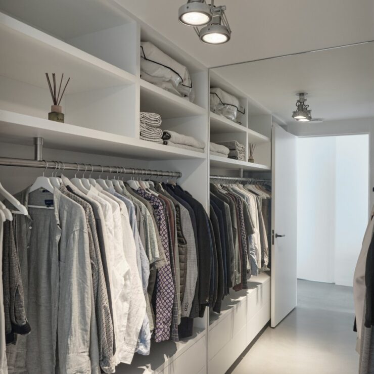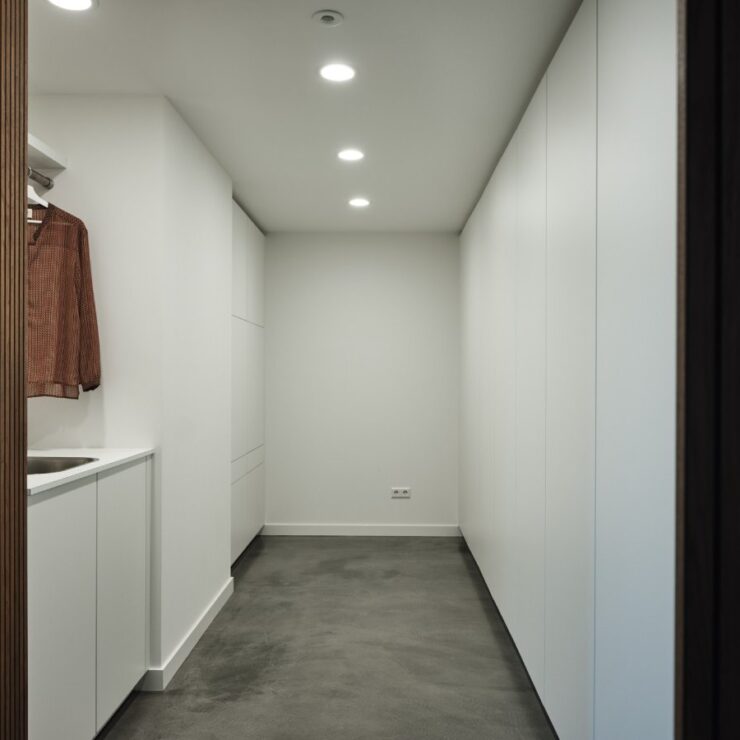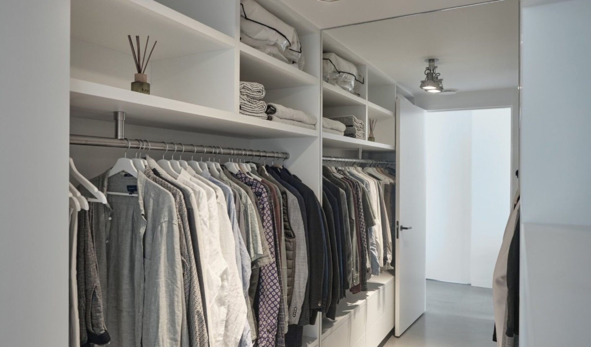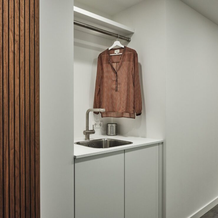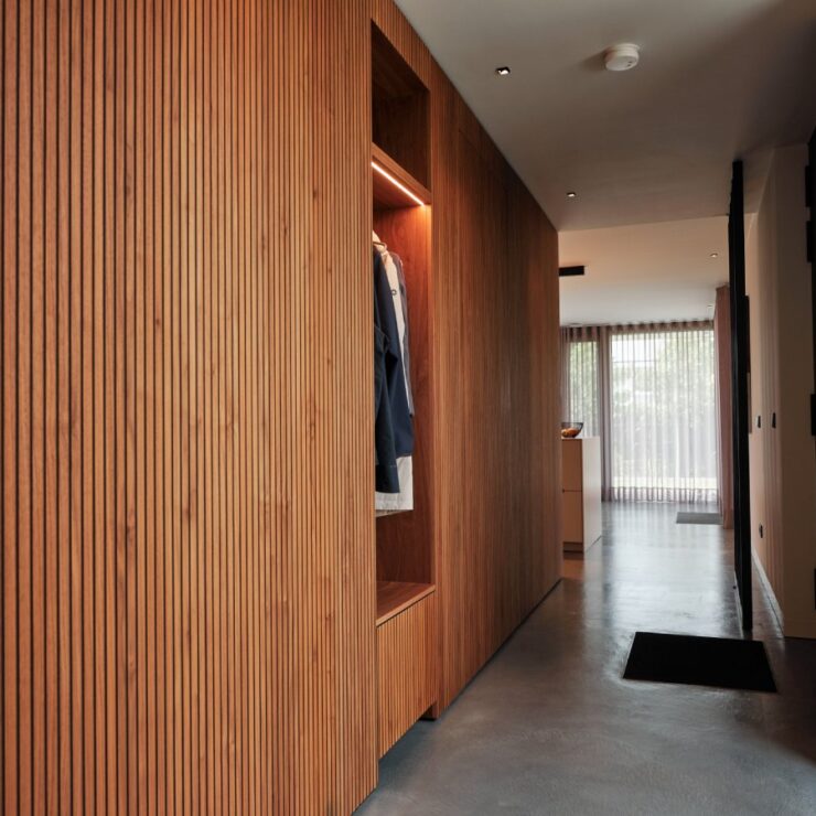 Een leuk detail in de hal is dat er naast de garderobekast, een ‘geheime’ deur verwerkt zit. Deze is naadloos in de wand verwerkt waardoor je een praktische én stijlvolle oplossing hebt voor de doorgang.