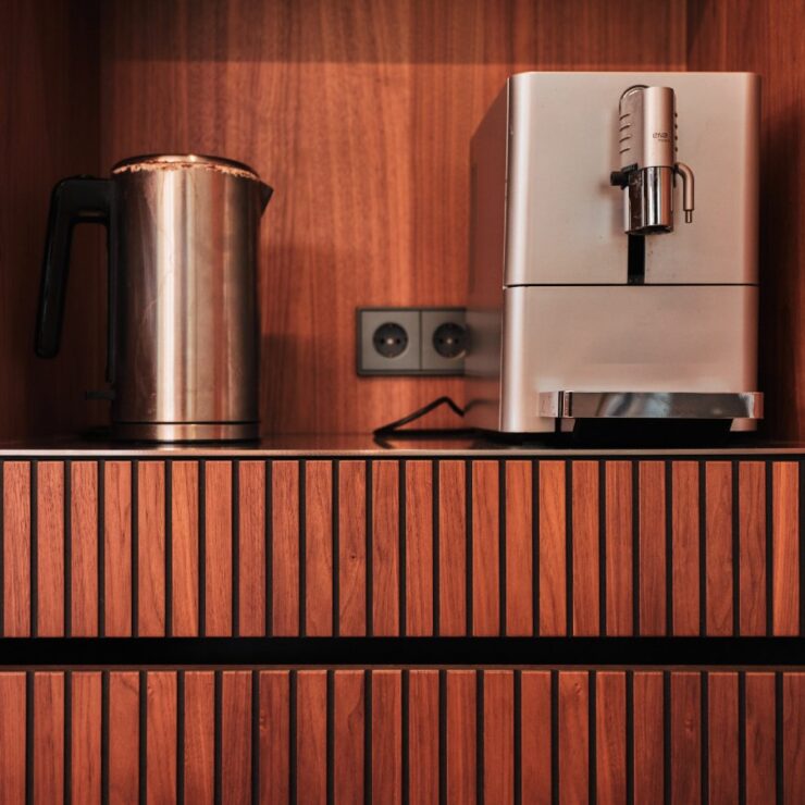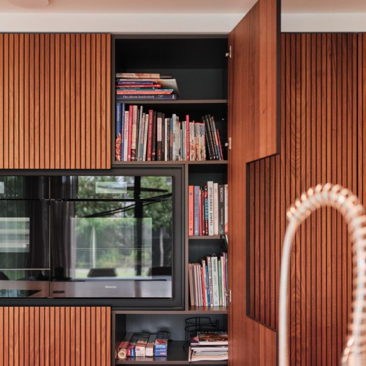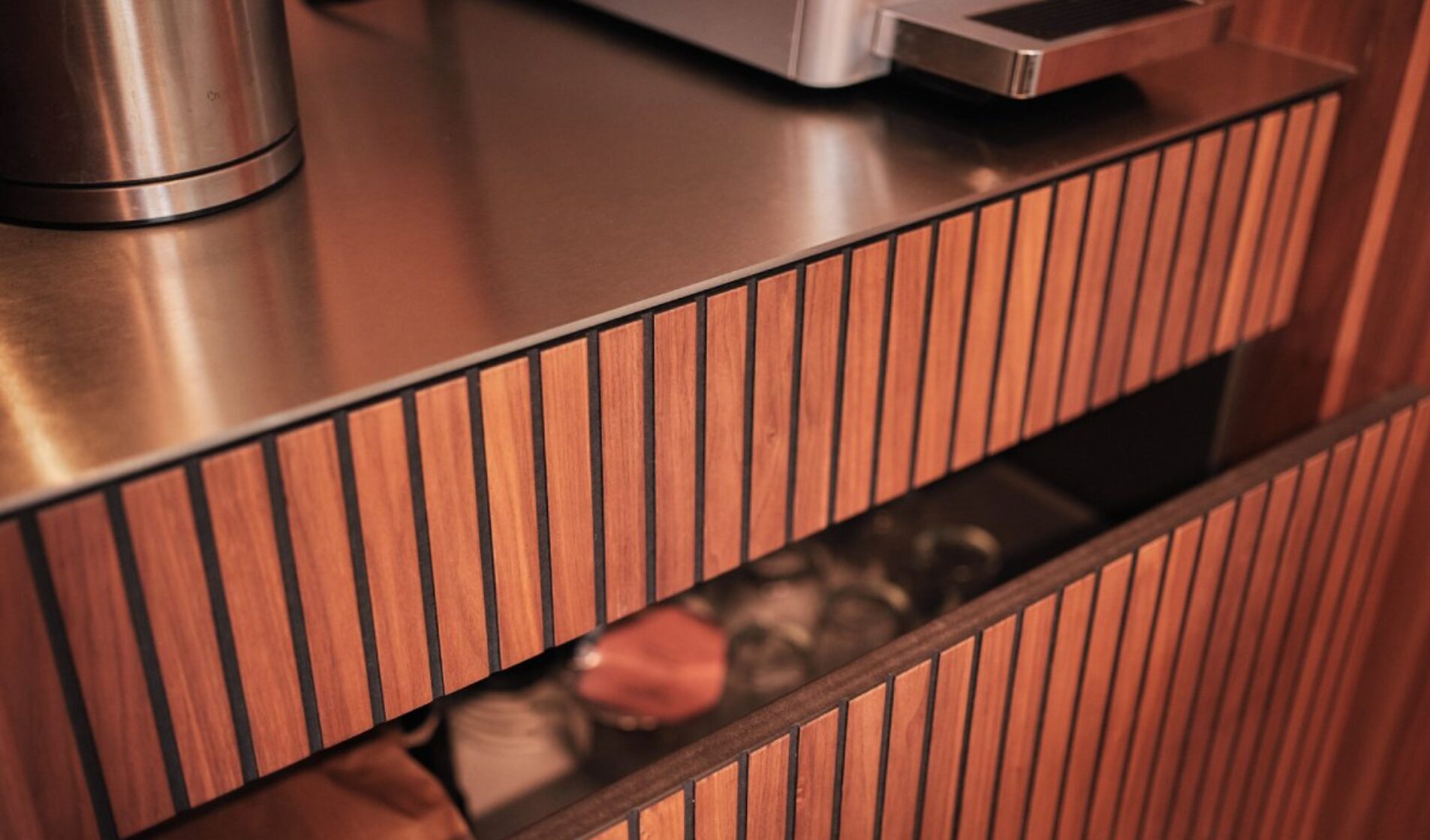 Nog een leuk detail in deze keuken is dat er in de kastenwand een koffienis verwerkt zit! De binnenkant van deze de wandjes van deze koffienis zijn ook in noten fineer, maar dan zonder groef en het blad in de koffienis bestaat uit RVS.