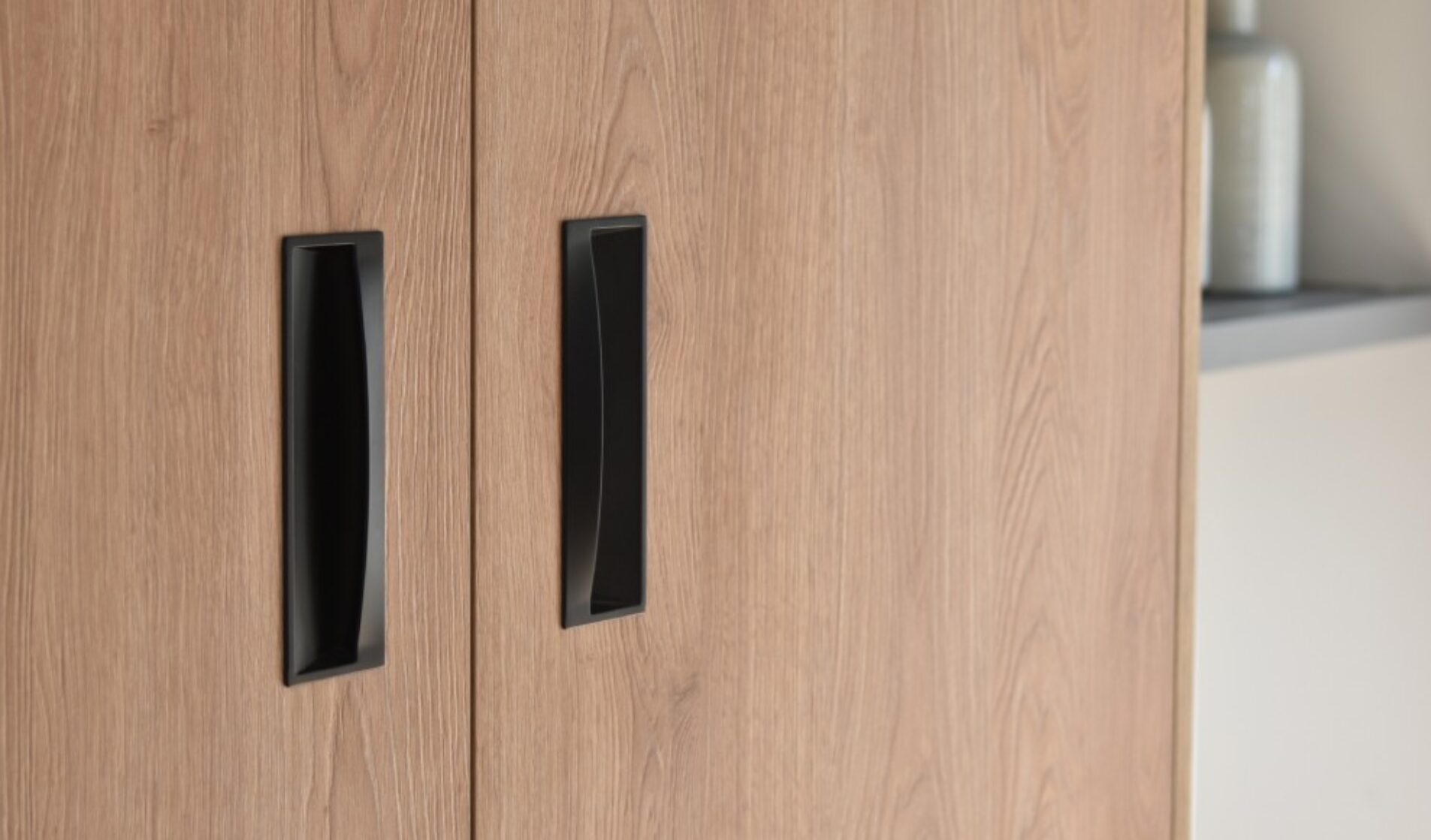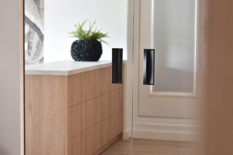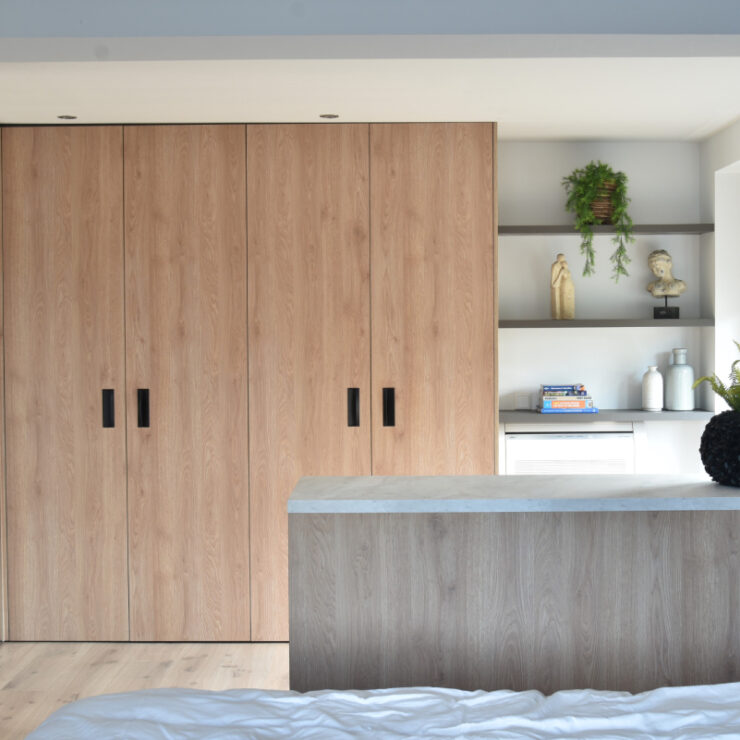 In de slaapkamer is er gekozen voor verschillende soorten kleuren van het front Monza welke in de complete woning terug komen. Voor de wandschappen is hetzelfde materiaal gebruikt als de keuken en bijkeuken. De kledingkasten zijn voorzien van houtlook Monza fronten, terwijl de ladekast voorzien is van een wit Monza front. Op deze manier komt de stijl van de woonkamer ook terug in de slaapkamer en wordt de woning echt een geheel. Ook in de hal zijn er twee verschillende Monza fronten gebruikt.