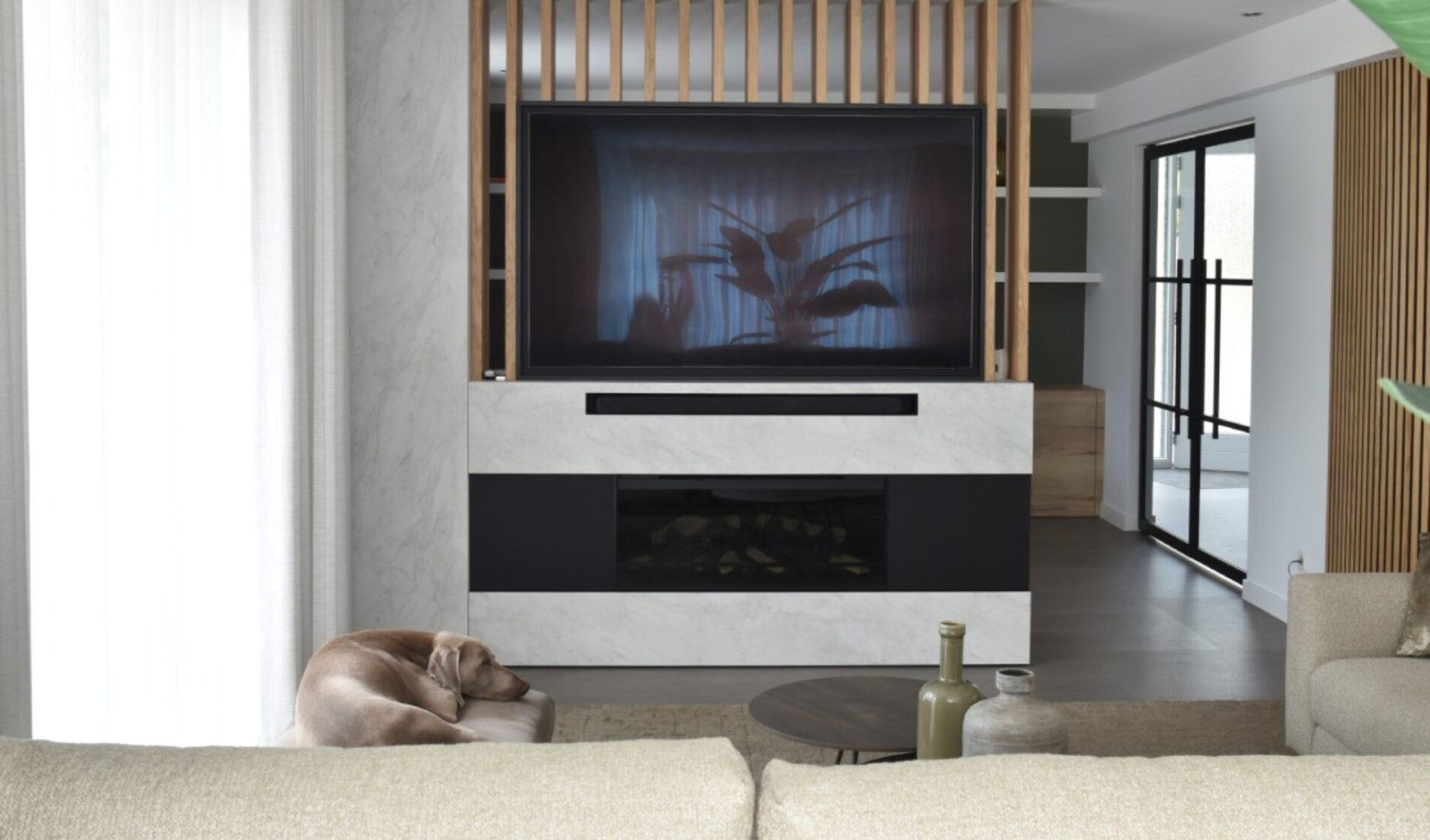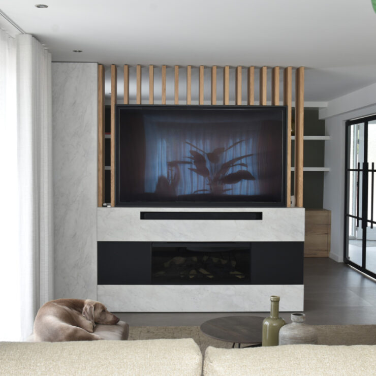 Voor de woonkamer van deze prachtige woning mochten we een roomdivider met tv-meubel realiseren. Deze stijlvolle roomdivider bestaat uit een TV-ombouw mét nis voor de soundbar en een haardombouw bestaande uit demontabele panelen. De roomdivider is afgewerkt met het front Monza. Verder zijn in de woonkamer ook de ronde wanden bekleed met panelen, waardoor de ruimte een natuurlijke en warme sfeer krijgt.