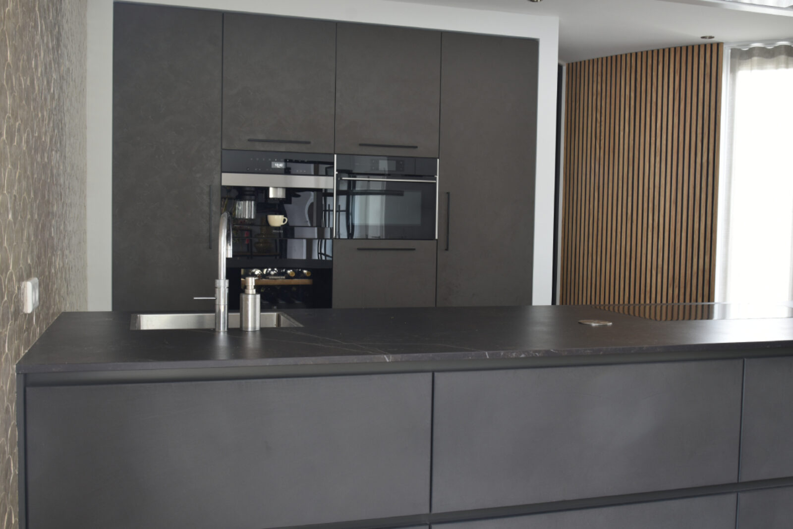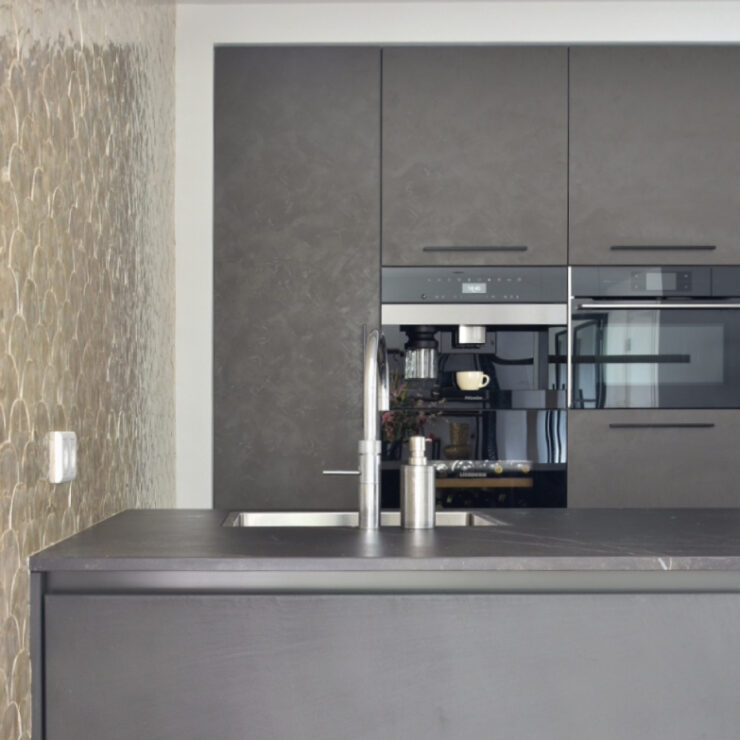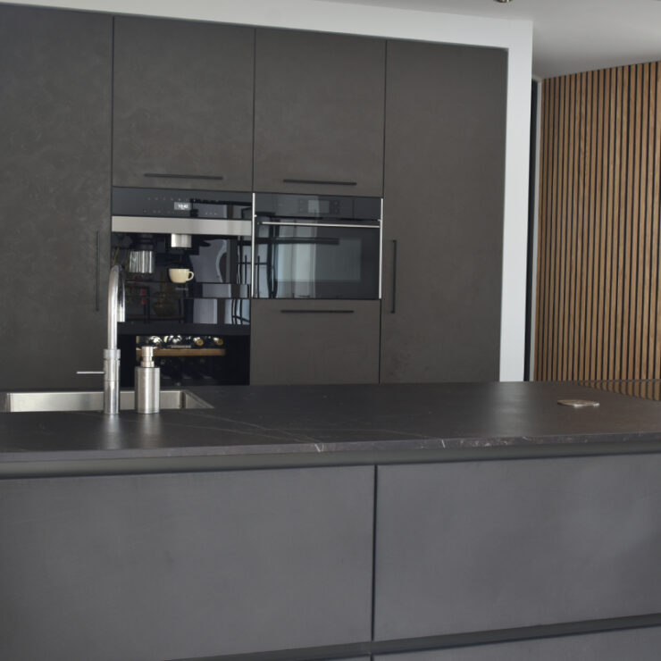 Voor deze moderne keuken is er gebruik gemaakt van 2 verschillende fronten. Voor de kastenwand is er gekozen voor het front Monza in een warm grijze kleur met de uitstraling van stucwerk. In het kookeiland is er gekozen voor betonfronten in de kleur dark grey. Deze donker grijze fronten worden gecombineerd met een grijs Dekton blad waardoor je een ton-sur-ton keuken creëert. Dit wil zeggen dat er van dezelfde kleur, verschillende tinten worden gebruikt om zo harmonie in de keuken te creëren.