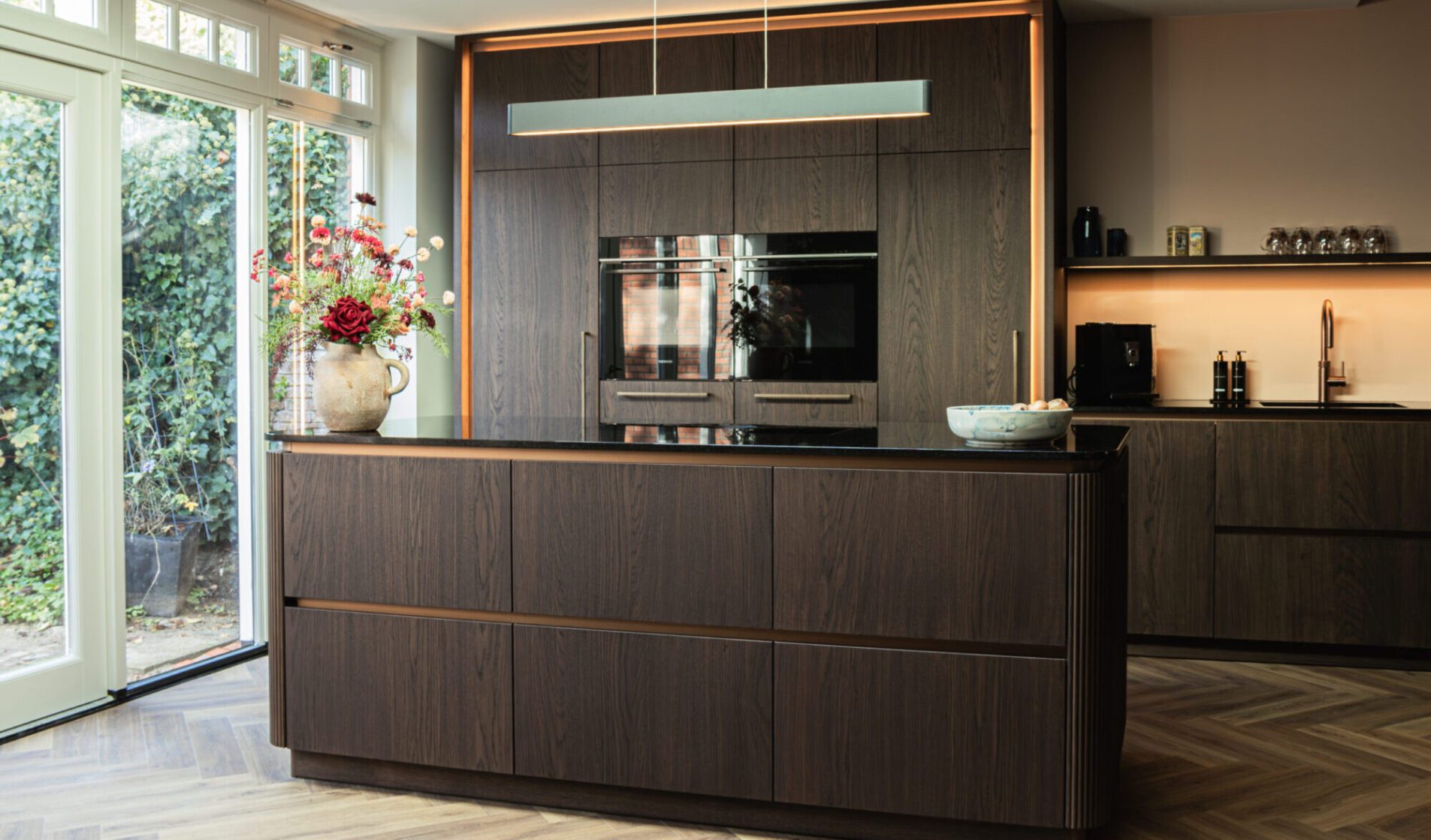 Deze ruime leefkeuken valt op door het gebruik van warme materialen en de sfeervolle verlichting die in de gehele keuken is gerealiseerd. De keuken is voorzien van Mereno Milano fronten, gerealiseerd met eiken fineer. Het donkere eiken fineer geeft een warme en luxe uitstraling, wat nog eens extra versterkt wordt door de verlichting die in de kastenwand is geïntegreerd. In de keuken is gekozen voor greeplijsten in de kleur rosé koper.