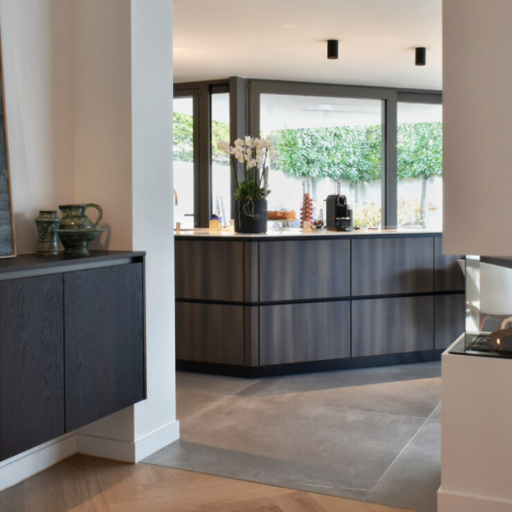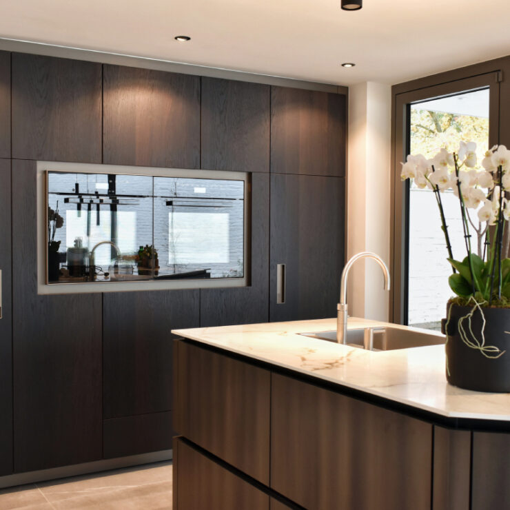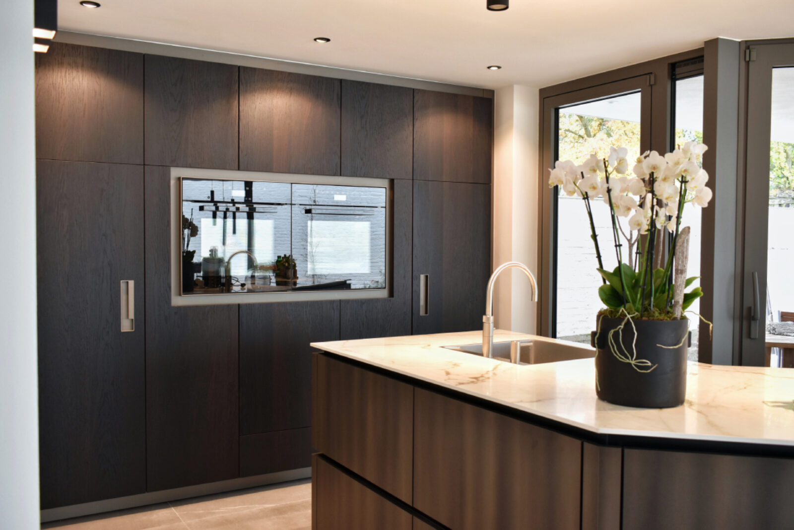 In deze keuken is er gebruik gemaakt van 2 verschillende fronten. In de kastenwand en de eettafel is er gekozen voor Milano fronten in gerookt eiken fineer. In het kookeiland is er een ander front gebruikt, namelijk het front Monza in de kleur zwart. Dit warme front gaat perfect gepaard met het werkblad van keramiek in de kleur Marconia met een soft glans afwerking. De combinatie van de twee warme fronten en het lichte werkblad, zorgt voor een warme en chique look in de gehele ruimte.