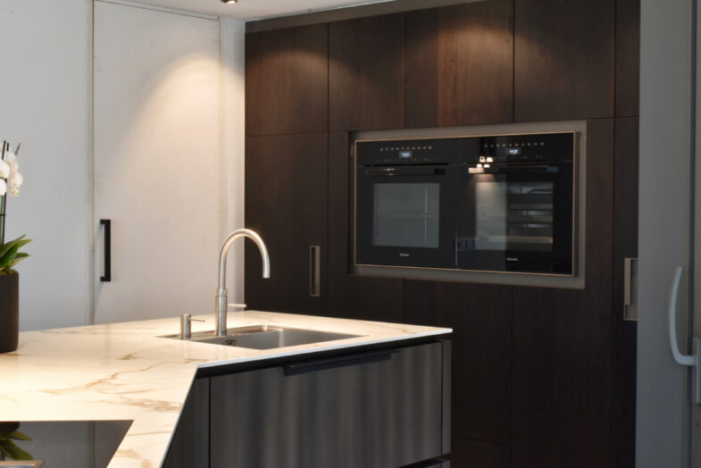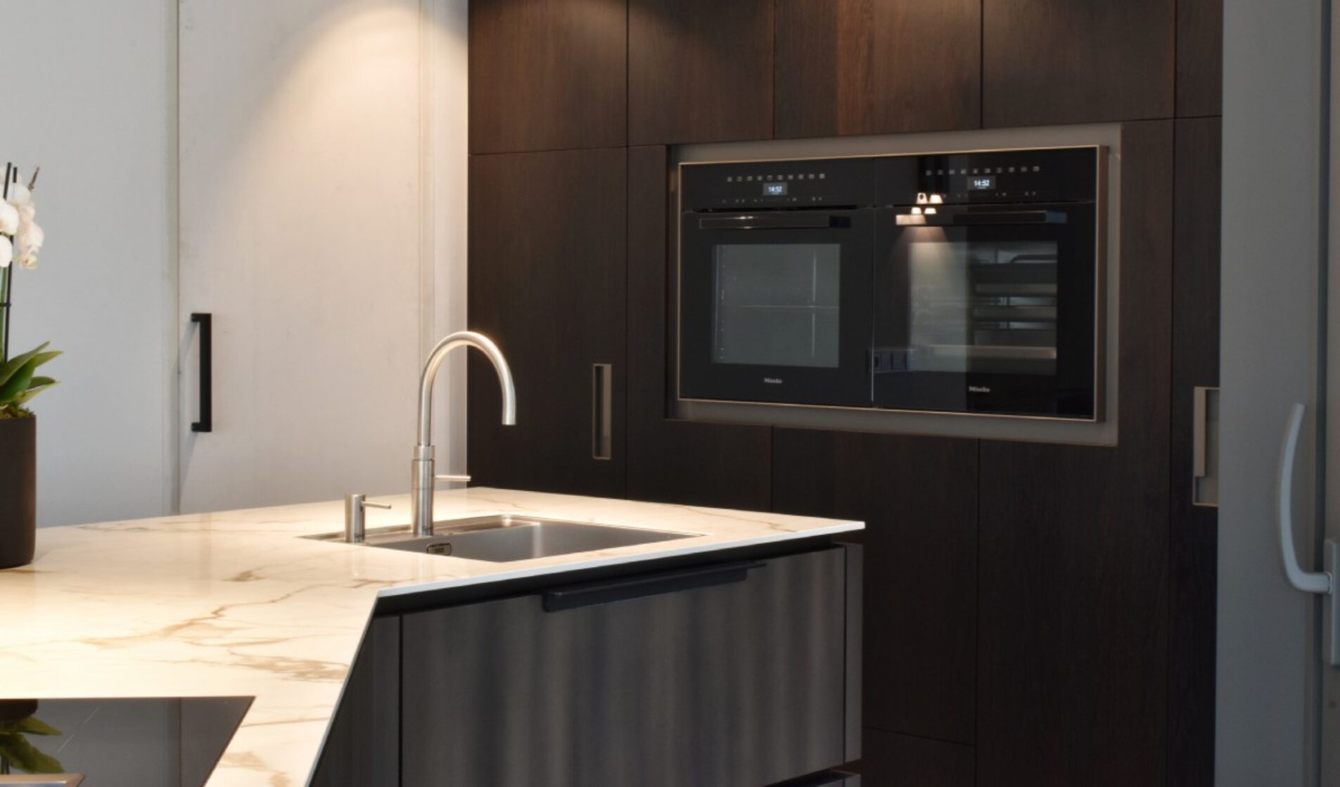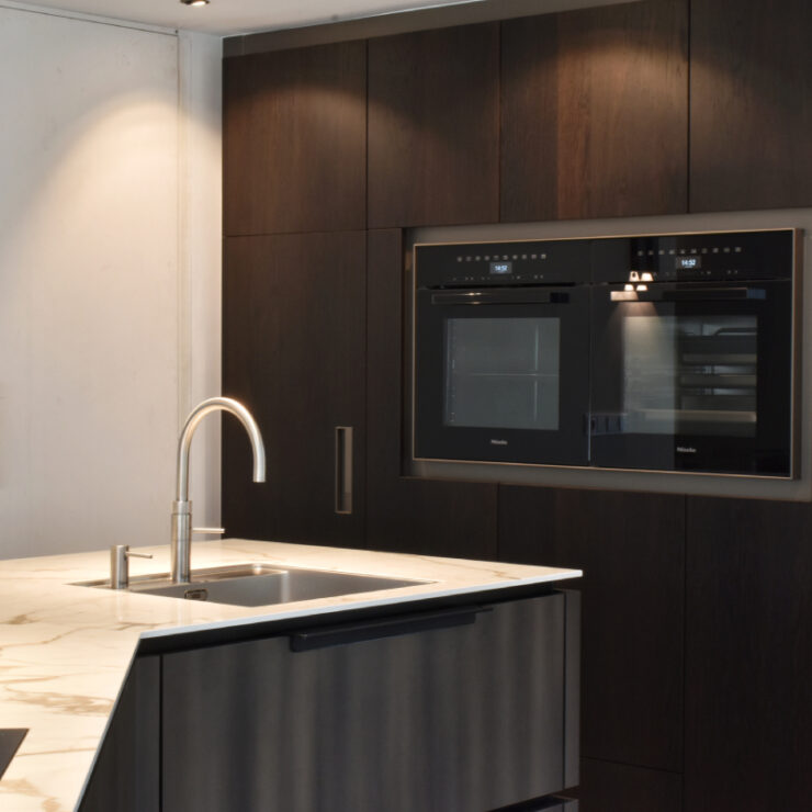 De keuken is voorzien van een Miele stoomoven, oven, vaatwasser, koelkast en kookplaat. Daarnaast is er gekozen voor een Quooker kraan en een bijpassende Quooker zeeppomp.